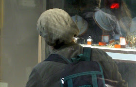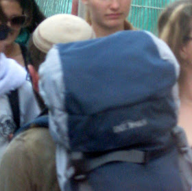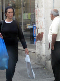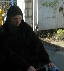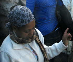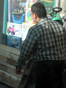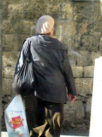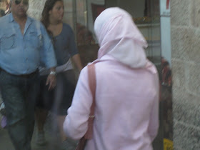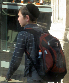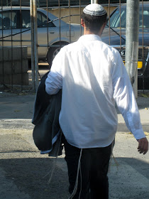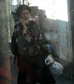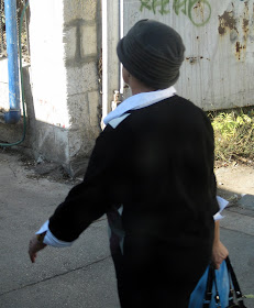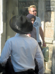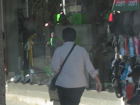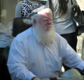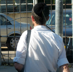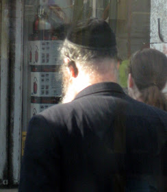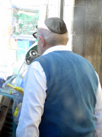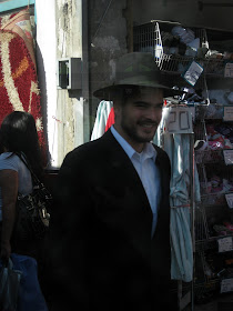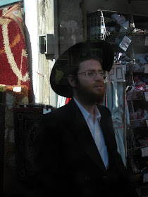 Yafo St, one of the main thoroughfares through the center of town, is currently ripped to shreds as Jerusalem gets ready for a Light Rail. It should arrive some time in the next century - I can't wait. In the meantime, my usual 15 minute bus ride to town is more like 45 minutes. And today, it was an hour and 15. To keep myself entertained, I took pictures of headgear. Here is a sampling of the headgear you will find on a few blocks of Yafo, in the city center, if you sit on a stationary bus for an hour. By pure chance, I ended up with exactly 100 pictures, though I pruned some because they were similar to the others, and because I got tired. There are some varieties we've already covered, and some that will be discussed later. I haven't commented individually because there is too much bulk. Take your time, it took me over an hour.