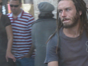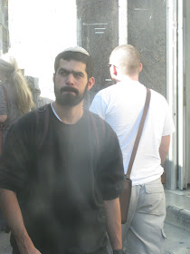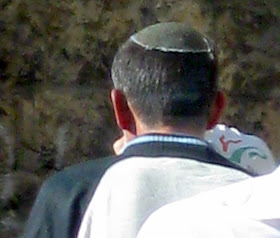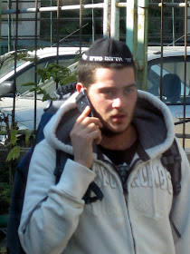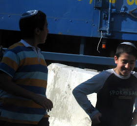 The next few pictures are of "knit kepot." Knit kepot are most often worn by members of the dati leumi community - literally "religous and patriotic." - these hats often denote rightist political leanings and strong sense of Zionism. Unlike the Haredim, or black hats, above, who often do not support the state of Israel because it is too secular, people wearing knit kepot are often fiercely patriotic. They also, as a rule, serve in the army, whereas the black hatters, as a rule, do not. Obviously there are exceptions to both rules. I will go in into the culture surrounding the knit kepah in more depth when I get around to giving them their own entry.